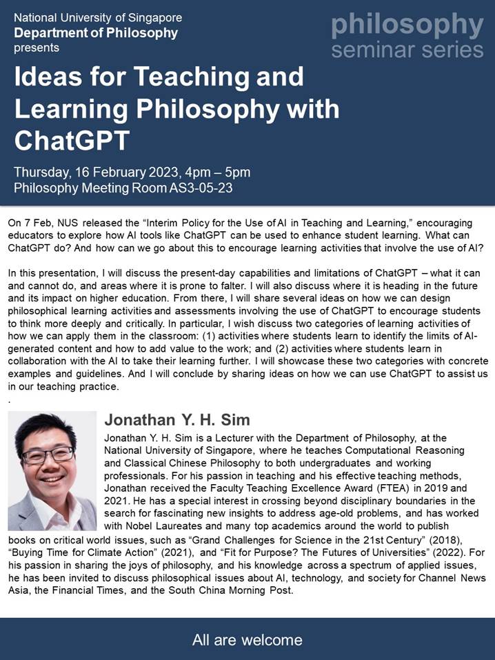Feb 2023: “Ideas for Teaching and Learning Philosophy with ChatGPT,” talk organised by the NUS Department of Philosophy.